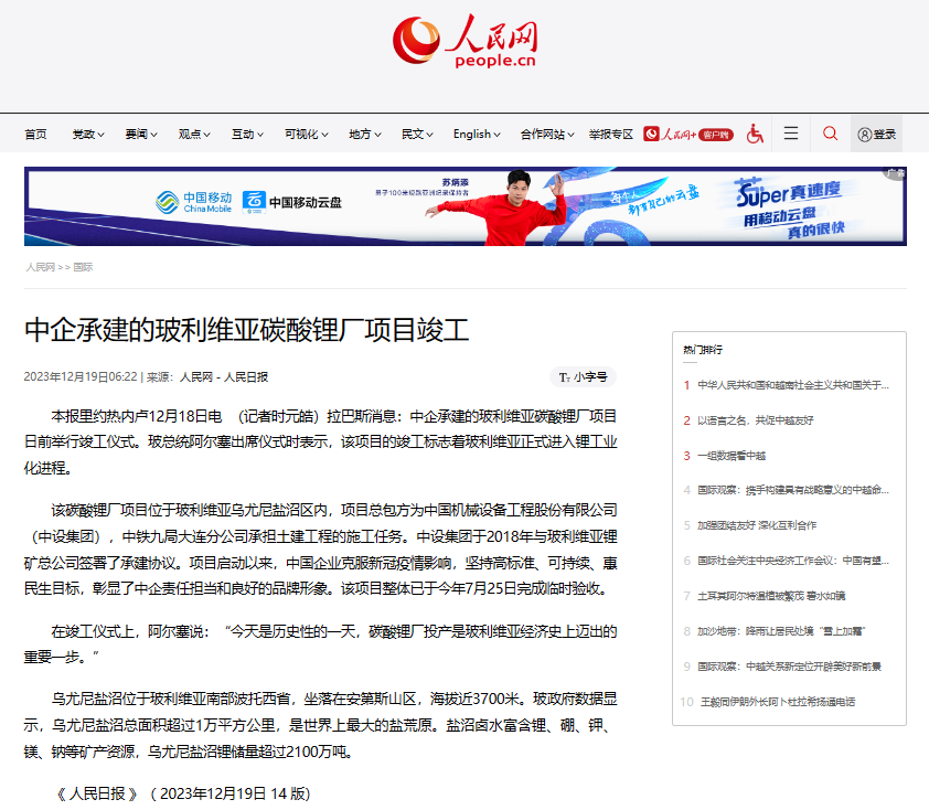 人民日報報道國機工程集團總部(中設集團)總承包項目——玻利維亞碳酸鋰廠啟動以來,克服新冠疫情影響,堅持高標準、可持續、惠民生目標,彰顯了中企責任擔當和良好的品牌形象。